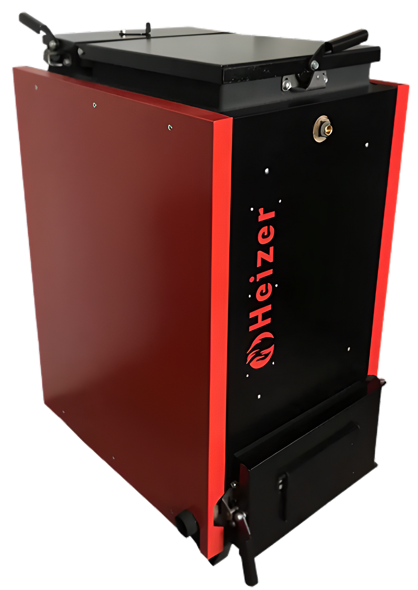 Це котли верхнього завантаження нижнього горіння. Конструкція шахти котла Heizer дає можливість попередньо підсушити паливо для ефективнішого спалювання в топці. Через вертикальну шахту паливо потрапляє на чавунні колосники, де й відбувається процес згоряння й тління завантажувального палива. Під колосниками розміщений відсік попільника, у якому накопичується зола. Очищення зольної скриньки відбувається раз на 2-3 дні. На дверцятах зольника розташовується механічний пристрій, що регулює подавання первинного повітря в зону горіння палива.